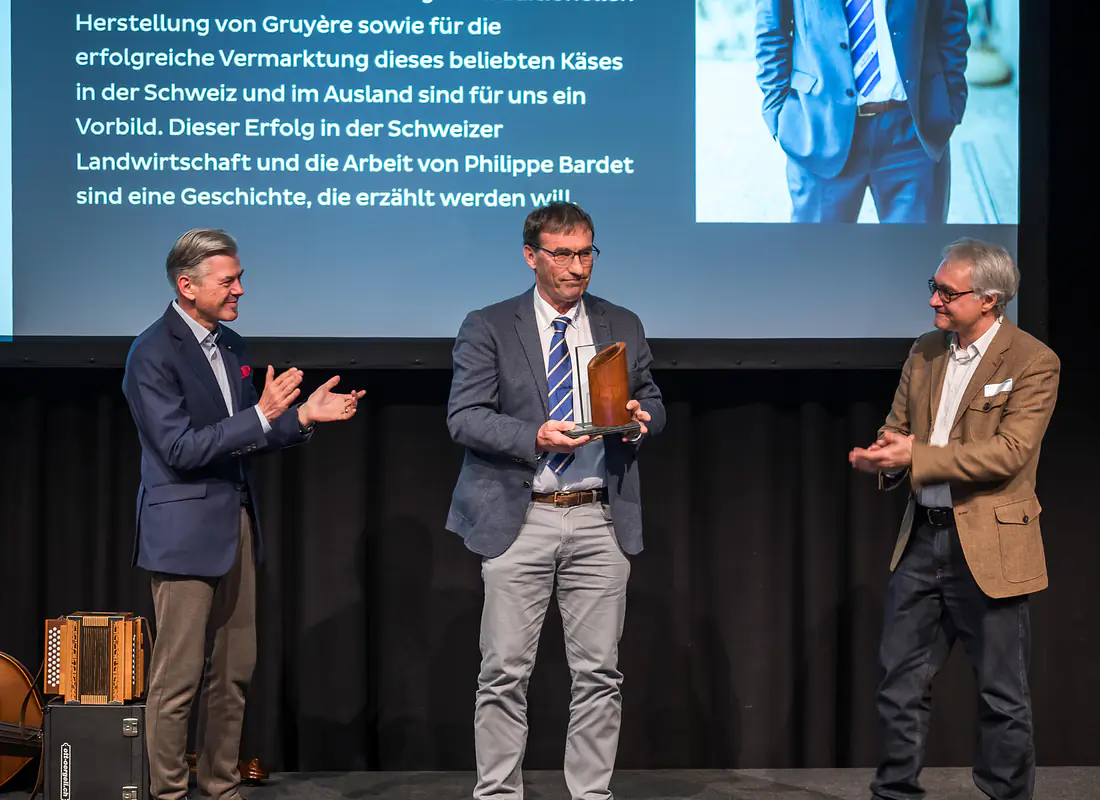 Philippe Bardet ist Agro-Star 2025! Der Direktor der Interprofession du Gruyère AOP erhält den Preis für sein jahrzehntelanges Engagement zur Bewahrung und Vermarktung des Gruyère AOP. «Philippe Bardet ist ein initiativer Mensch, dem Echtheit und Tradition am Herzen liegen und der zu-gleich die Dynamik des Marktes versteht», sagt Prof. Dr. Pietro Beritelli, Jurypräsident Agro-Star Suisse und Vizedirektor des Instituts für systemisches Management und Public Governance an der Universität St.Gallen (rechts im Bild). Die Jury wählte Bardet einstimmig zum Preisträger – als Anerkennung für seine 28-jährige Tätigkeit an der Spitze der Sortenorganisation Interprofession du Gruyère AOP.