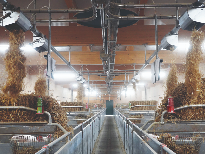 Mit dem Stroh kommt normalerweise auch Staub in den Stall und verursacht gesundheitliche Probleme für Mensch und Tier. Mit «Strohmatic», dem automatischen Einstreusystem, kann das vermieden werden. Mit der patentierten Entstaubung wird bis zu 80 % des Staubes abgesaugt, bevor das Stroh in die Buchten der Tiere rieselt.