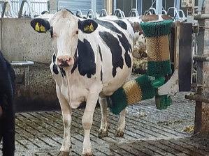 Ein neues, mit einem Schweizer Landwirt entwickeltes Gerät massiert und reinigt die Tiere am Bauch und Euter dank dem umgedrehten SCHURR 2-Bürstensystem.